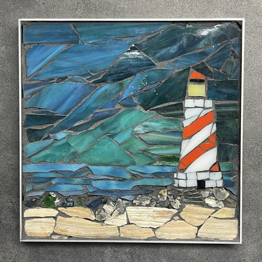 “Lifehouse” illustrates being a steady light. The upcycled sharp broken glass & found shell pieces — find purpose when pieced together. That lighthouse standing tall against the choppy blues? That’s us — grounded on sturdy rock, surrounded by timeless sand & sea, showing up despite the chaos, our light making dark skies brighter.