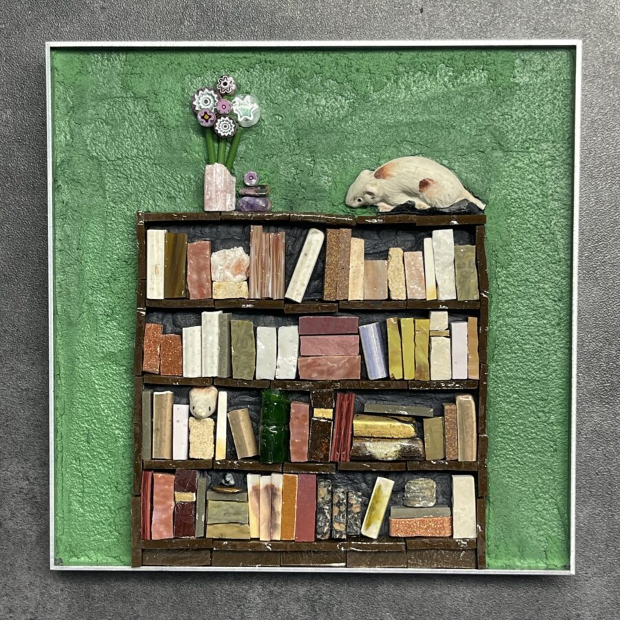 Omi’s bookcase was created to showcase an upcoming Small and Mighty Bookcase Workshop I will be teaching as well as an antique ceramic shoe of my grandmothers that had two cute little mice on it. The ceramic was chipped so I broke it apart and saved the mice.