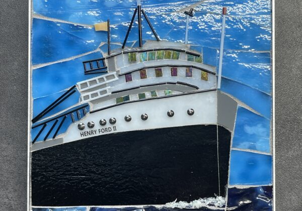 Henry Ford II – Great Lakes Freighter 2025 6″ x 6″ stained glass, ribbons, stringers RESERVED On Michigan’s Great Lakes, Freighters, or Bulk Carriers, are designed to carry up to 70,000 tons of raw materials from port to port,...