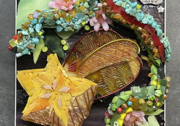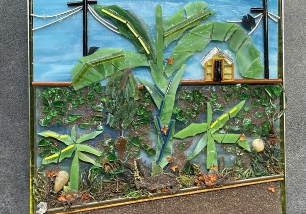 Tropical Plants – Mata de Plátanos 2025 6″ x 6″ stained glass, sand, stringers, dried flowers and moss, metal wire $389 I began working with mosaic art after my retirement. Creating mosaics has become a form of therapy for...