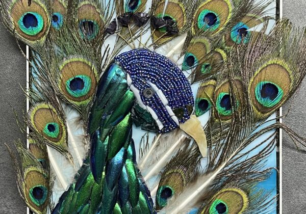 Gotta Love ‘Em 2025 6″ x 6″ peacock feathers, iridescent seed beads, stained glass, millefiori and ethically harvested beetle wings $250 I’ve always felt that a peacock provides breathtaking displays of vibrant colors with its ornate feathers, and I...
