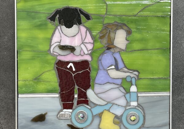 Out My Kitchen Window: The Wheels Are Turning 2025 6″ x 6″ stained glass, filati, fused glass balls, metal washers $200 This piece was inspired by the little girl that lives across the street from me who I have...